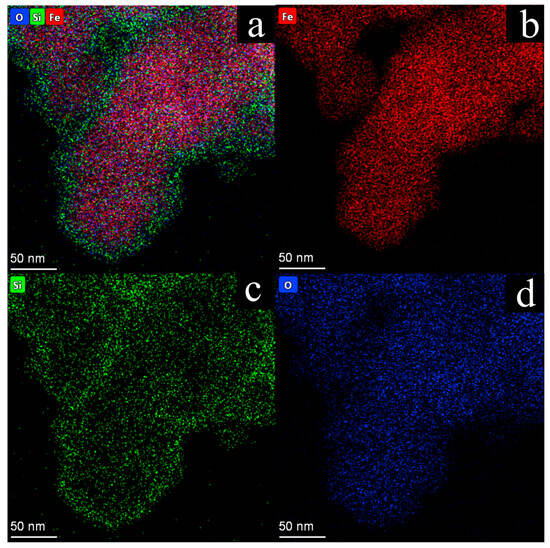 To further confirm the core–shell structure, EDS elemental mapping was performed (Figure 4). The elemental mapping clearly visualized the spatial distribution of constituent elements, with Fe signals (Figure 4b) precisely confined to the core region, exhibiting a well-defined spherical distribution that corresponded to the Fe2O3 core. In contrast, both Si (Figure 4c) and O (Figure 4d) signals extended uniformly throughout the entire particle, with a noticeable enhancement in the signal intensity in the shell region. This distribution pattern provides conclusive evidence of the successful formation of the Fe2O3@SiO2 core–shell structure, with the complete encapsulation of the Fe2O3 core by the SiO2 shell, consistent with the TEM observations.