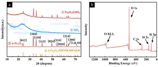 The crystal structure and phase composition of the samples were investigated by XRD analysis (Figure 5a). The sharp diffraction peaks of the Fe2O3 NPs (Figure 5a—①) matched well with the standard α-Fe2O3 phase (PDF#98-000-0240), which belongs to the hexagonal crystal system with space group R-3c (167). This good agreement indicates the high phase purity of the sample. The broad peak centered at around 2θ = 15°~25° in Figure 5a—② corresponded to amorphous SiO2. After core–shell formation, the Fe2O3@SiO2 NPs exhibited the characteristic peaks of both the α-Fe2O3 and SiO2 phases (Figure 5a—③), showing the superposition of the sharp diffraction peaks from crystalline α-Fe2O3 and the broad peak from amorphous SiO2. The presence of only these two phases indicates that the SiO2 was merely coated on the surfaces of the α-Fe2O3 NPs, without forming any new phases. This confirms the successful synthesis of the intended core–shell structure. The XPS spectrum analysis (Figure 5b) revealed no Fe2O3-related peaks on the surface, confirming the complete encapsulation of the nanoparticles and validating the successful formation of the core–shell structure through surface chemical composition analysis.