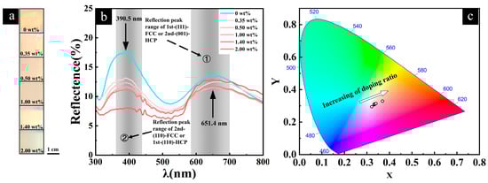 The variation in the Fe2O3@SiO2 NP doping concentration led to clear color evolution in the visual appearance of the opal films (Figure 7a). As the doping ratio increased from 0 wt% to 2.00 wt%, the films exhibited a gradual structural color transition. This color evolution was quantitatively analyzed through reflection spectroscopy (Figure 7b). The reflection spectrum of the undoped film showed dual peaks, with a dominant peak at 390.5 nm and a secondary peak at 651.4 nm. Previous studies have reported similar double reflection peaks in opals as exhibited by our samples, attributing them to distinct Bragg reflections originating from different crystallographic planes within the close-packed structure [3]. With increasing Fe2O3@SiO2 NP content up to 2.00 wt%, the reflectance intensity at 390.5 nm decreased consistently from 17.6% to 8.0%. At 651.4 nm, the reflectance intensity exhibited a more complex trend: it first decreased from 13.6% to 11.5% as the doping ratio increased from 0% to 0.5% and then returned to the same reflectance intensity of 11.5% at a 1% doping concentration, and it finally increased to 12.8% at a 2% doping concentration. The overall downward trend in the reflectance intensity from a 0% to 0.5% doping ratio, followed by an identical reflectance value at a 1% concentration, suggests that the minimum reflectance intensity likely occurred at an approximately 0.75% doping ratio.