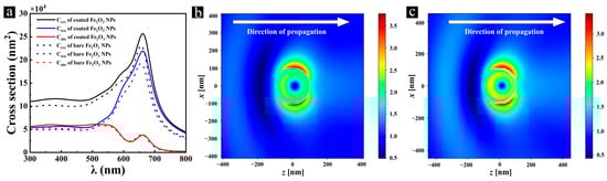 (a) The simulated absorption (Abs), scattering (Sca), and extinction (Ext) spectra of 225 nm Fe2O3 nanoparticles and Fe2O3@SiO2 nanoparticles; (b,c) the simulated near-field electric field intensity () distributions around Fe2O3 nanoparticles (b) and Fe2O3@SiO2 nanoparticles (c) at 650 nm.