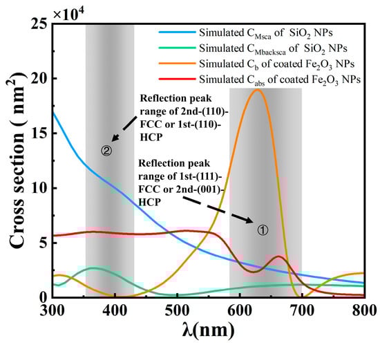 Combining the above findings, we compared the optical properties (i.e., absorption and backscattering) of the nanoparticles with the reflection peak regions of opal films to gain insights into the color effect mechanism (Figure 9). The key feature of Fe2O3@SiO2 NPs is their strong absorption in the short-wavelength range (300 nm~550 nm), as well as their significant backscattering abilities, with the backscattering cross-section being nearly four times than that of the absorption at 630 nm. The backscattering peak of Fe2O3@SiO2 NPs falls within the reflection peak range of the 1st-(111)-FCC or the 2nd-(001)-HCP of the opal film, although it is slightly offset from the center position at 651.4 nm. While the Fe2O3@SiO2 NPs exhibited absorption and backscattering contributions, the pure SiO2 NPs showed predominantly scattering behavior. In the reflection peak region of the 2nd-(110)-FCC or the 1st-(110)-HCP, multiple scattering simulations for SiO2 NPs indicate that the scattering cross-section exceeds the absorption cross-section and decreases with the wavelength. However, the backscattering cross-section constitutes only a small fraction of the total scattering cross-section, indicating the presence of incoherent scattering driven by complex multiple scattering interactions. These findings suggest that the relatively higher reflection peak intensity at 390.5 nm compared to 651.4 nm in undoped opal films may be attributed to multiple contributing factors. These include the 2nd-(110)-FCC or 1st-(110)-HCP, the multiple backscattering of SiO2 NPs, and the incoherent scattering of SiO2 NPs. In contrast, the 651.4 nm reflection peak appears to primarily arise from the 1st-(111)-FCC or 2nd-(001)-HCP. As the doping concentration increases, both peaks decrease, with the 390.5 nm peak showing a more significant reduction. This is likely due to the strong absorption of incoherent scattering by Fe2O3@SiO2 NPs [64], which dominates the reflection at this wavelength. The 651.4 nm reflection peak exhibits an initial decrease followed by an increase with higher Fe2O3@SiO2 NP doping concentrations, potentially due to the contribution of Fe2O3@SiO2 nanoparticle backscattering to the peak intensity.