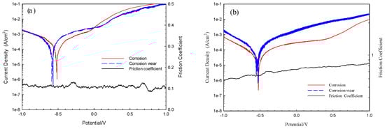 Under tribocorrosion conditions, as shown in Figure 6c,d, the corrosion current density curves displayed considerable fluctuations due to the mechanical wear effects. At +100 mVSCE and +500 mVSCE, the passive layer on the specimen surface was continuously disrupted by wear, leading to the generation of wear debris and the repeated exposure of fresh, unoxidized surfaces. As the wear progressed, corrosion penetrated deeper into the substrate, resulting in a notable increase and fluctuation in corrosion current density. These variations reflect the instability of the corrosion process in a dynamic frictional environment.
