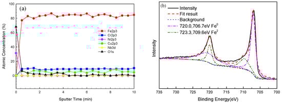 Depth profiling analysis was performed on 17-4PH stainless steel using X-ray photoelectron spectroscopy (XPS) to investigate the elemental distribution of Fe, Cr, Ni, Cu, Nb, and O along the surface-to-subsurface direction. The analysis was conducted on SLM-fabricated specimens subjected to different polarization potentials (OCP, −300 mVSCE and +500 mVSCE) in seawater. Ar+ ion sputtering was applied at 3 kV over a 2 × 2 mm area, with a calibrated etch rate of 44.72 nm/min based on SiO2. Spectral measurements were taken at 1 min intervals after each etching cycle, as shown in Figure 13a. From the depth profiles, the atomic concentration of iron under OCP conditions averaged approximately 83 at%. However, under +500 mVSCE the formation of FeO due to oxygen uptake was evident, suggesting enhanced oxidation. The FeO phase is known to be structurally loose and thermodynamically unstable, which facilitates iron ion diffusion and reduces the surface Fe concentration.