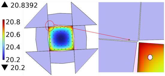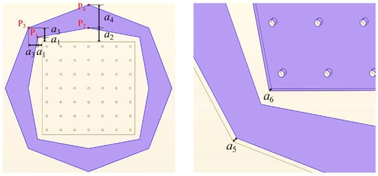 To reduce the computational complexity, appropriate simplifications are made in designing the auxiliary cathode to maximize the relative relationship between the auxiliary cathode and the cathode while saving computational resources. Combined with the case of Figure 3b, the thickness of the outer contour of the cathode is symmetric at the midpoint, and it gradually increases from the midpoint to the endpoint. The geometric parameters of the auxiliary cathode are defined through the schematic diagram shown in Figure 4. The position and shape of the auxiliary cathode (blue region) are precisely controlled by the following parameters: Considering symmetry, the endpoints of the auxiliary cathode (P1, P2, P3, P4) are positioned on the diagonal of the square cathode or on a line perpendicular to the boundary. Specifically, for the endpoints on the diagonal (P1 and P3), the perpendicular distance to the cathode boundary is defined as a1, while the perpendicular distance to the opposite boundary is a1 + a3, where a3 represents the additional offset extending outward from the initial distance a1. For the endpoints on a line passing through the cathode center and perpendicular to the boundary (P2 and P4), the perpendicular distance to the boundary is defined as a2, and the perpendicular distance to the opposite boundary is a2 + a4, where a4 represents the additional offset distance. By adjusting the values of a1, a2, a3, and a4, the shape and width of the auxiliary cathode can be flexibly controlled, thereby optimizing its impact on the electric field distribution. Furthermore, since the distance between the anode and cathode significantly affects the uniformity of electroforming thickness—where an excessively large or small distance can lead to uneven electric field line distribution []—the parameter a5 is introduced to represent the height difference between the auxiliary cathode and the cathode surface, and a6 is introduced to represent the thickness of the photoresist (non-conductive layer). These parameters are used to regulate the uniformity of the electric field lines and influence the current density distribution during the electrodeposition process, respectively, ensuring that the auxiliary cathode effectively improves thickness uniformity in the electroforming process.