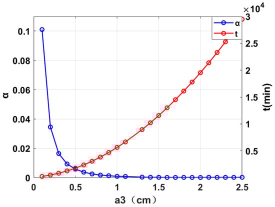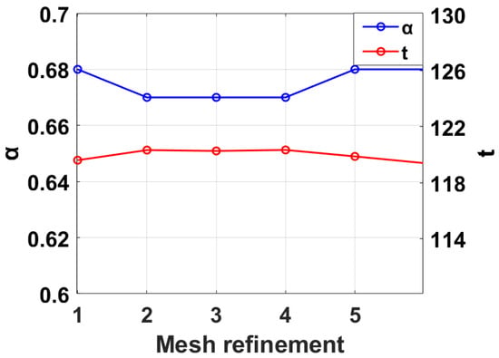 To verify the effect of gridding on the calculation results, a set of auxiliary cathode parameters (a1 = 1 × 10−4, a2 = 3 × 10−4, a3 = 2 × 10−4, a4 = 5 × 10−4, a5 = 3 × 10−5, a6 = 5 × 10−5, unit: m) is selected to simulate the unevenness of electroforming thickness α and plating time t under different grid numbers with of 20 um. The relevant results are summarized in Table 3 and plotted in Figure 5.