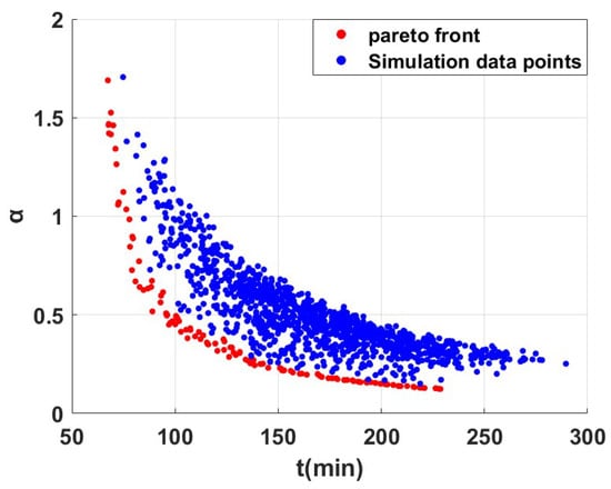 In this paper, multi-objective optimization is accomplished based on NSWOA. The optimization solution to the problem is found by simulating the foraging behavior of the whale population, while non-dominated sorting is used to deal with the multi-objective problem. The optimization process includes generating the population, evaluating individual fitness, non-dominated sorting, and updating the population; finally, the optimized Pareto front is obtained through multi-generation iterations, to minimize α and t. The population size is set to 150, and the maximum number of generations is 30. After each optimization, a few points of the Pareto front are selected for validation, the simulated values are added to the training set, and multiple rounds of training and optimization are performed to make the final solution set as close as possible to the real Pareto front; uniformity is maintained in the distribution of the solution set.