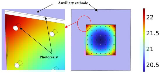 However, due to the extremely small scale and high precision requirements of micro-electroforming processing, the uniformity of the thickness of the electroforming layer is difficult to control during its process []. This inhomogeneity is mainly reflected in the difference between the deposition rate of the middle and edge regions of the cathode surface, leading to its inconsistent thickness, which in turn affects the performance and service life of the metal micro-devices []. To solve the above problem, the application of an auxiliary cathode has been well-proven as an effective optimization method. By rationally designing the auxiliary cathode, the current density distribution can be improved, which in turn improves the thickness uniformity of the electroforming layer (Figure 1). For example, Xiang et al. [] investigated the application of auxiliary cathodes in copper plating circuits and found that increasing the width of the auxiliary cathode can significantly improve the plating uniformity. Wang et al. [] compared four auxiliary cathode shapes—namely, circular, square, square triangle and square hexagon—and examined the improvement effect of different shapes of auxiliary cathodes on the thickness uniformity. Zhao et al. [] proposed a method of co-cast layer thickness uniformity similar to the coplanar auxiliary cathode design that resembles the local microstructure of the mold, which improved the thickness uniformity of the electroforming mold by 49.1%. In addition, Zhan et al. [] explored the effect of auxiliary cathode dimensions on the thickness uniformity of micropillar elements, and their study showed that the optimal auxiliary cathode parameters were closely related to the cathode surface area. Wang et al. [] observed that the uniformity of electroformed gears improves with increasing thickness of the surrounding photoresist layer.