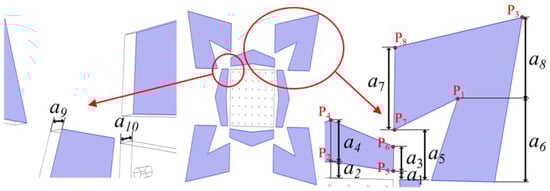 Many cathodes are not completely symmetrical at the endpoints, and the endpoints tend to have concentrated electric fields and the most uneven thicknesses. To make the auxiliary cathode shape more universal and able to adapt to a variety of complex cathode shapes, P1P2 and P3P4 in Figure 4 are split into two segments at the endpoint position, to increase the diversity of shapes at the endpoints, and the photoresist and auxiliary cathode height parameters are retained; the design of the auxiliary cathode shape is shown in the schematic diagram in Figure 10, as follows.
