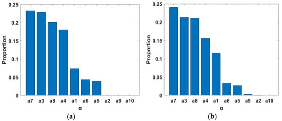 As can be seen from Figure 11, the weights of the geometrical parameters of the auxiliary cathode on the electroforming time remain the same under different current density conditions. Among them, the width parameters a3, a4, a7, and a8 are the core variables affecting the electroforming time, and their importance is much higher than other parameters. This is because the width of the auxiliary cathode directly affects the distribution of current density in the electroforming process, which in turn has a decisive effect on the overall electroforming rate. Specifically, the larger their values, the more dispersed the current density distribution, resulting in a lower electroforming rate, thus prolonging the electroforming time. Secondly, the parameters a5 and a6 of the distance from the cathode endpoint also have a significant effect on the electroforming time, although their importance is lower than the width parameter, still a key auxiliary factor; this is because the current density at the cathode endpoint is the largest, and the sensitivity to the auxiliary cathode regulation is the highest. a1 is also a distance parameter of the endpoint, but compared to the joint effect of a5 and a6, its effect on the time is weaker. In contrast, a2, although also a parameter of distance from the cathode, has a lower electric field strength relative to the endpoints and the current density in that direction can be regulated by a4, so its effect on the results is almost none. The height of the auxiliary cathode and the photoresist thickness parameters (a9 and a10) also have a negligible effect on the electroforming time. The reason for this is that the range of values for these parameters is only a few tens of micrometers, and their variations have almost no significant effect on the overall ion diffusion process and electric field distribution, respectively.
