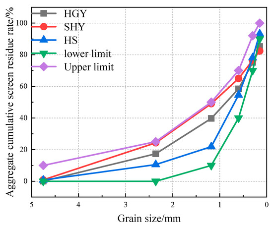 The fine aggregates utilized in this study comprise HGY, SHY, and HS. Specifically, HGY was sourced from the under-construction Cangwu-Rongxian Highway Project in Fucheng County, Wuzhou City, while SHY and HS were procured from the Old Man’s Village Sand, Stone, and Cement Store in Xixiangtang District, Nanning City. Sieve analysis tests were performed on the fine aggregates. The fineness modulus was calculated and used as the evaluation index to assess the coarseness and fineness of the aggregates. The cumulative sieve residue values and fineness modulus values for each grading level of the three types of fine aggregates are listed in Table 3. The results of the cumulative sieve residue of particles are shown in Figure 1.