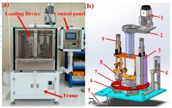 The schematic diagram of indoor abrasion tester (Nanning, China) is shown in Figure 2. As illustrated in Figure 2a, the device mainly consists of a loading device, a frame, and a console. The electric control box of the entire equipment set is located beneath the loading device and is safeguarded by the frame. The frame incorporates the control panel and the loading device. The control panel can govern the instrument switch, wheel elevation, vehicle load, wheel rotational speed, and water circulation. As illustrated in Figure 2b, the operational principle of the indoor abrasion tester encompasses drive components, pressure components, and a loading rotating platform. The drive components are composed of a motor, a drive belt, and a drive shaft. The motor is linked to the drive pulley on the drive shaft by means of the drive belt. The pressurizing components consist of a pressurizing cylinder, a slider, and a tire, which are sequentially connected from top to bottom. The pressurizing components are disposed in opposition to each asynchronized to each other and interconnected by upper and lower transverse steel plates. The drive shaft of the drive components is affixed to the upper transverse steel plate; the loading rotating platform comprises a central turntable and a steel plate track. The central turntable of the loading rotating platform is joined to the lower transverse steel plate, and the steel plate track is furnished with a specimen placement slot. The steel plate guide rail can serve as a test platform for embedding four 100 mm × 100 mm × 100 mm cubic specimens. The device can expedite the abrasion process of specimens.