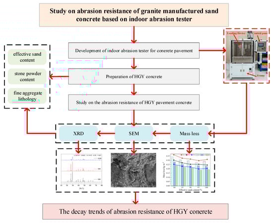 Upon the completion of specimen preparation, subsequent tests regarding abrasion resistance were then conducted. The research framework of this study is shown in Figure 4.