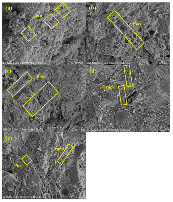 Microstructures of the cement stone in concrete with different effective sand contents ((a) S80, (b) S85, (c) S90, (d) S95, (e) S100).