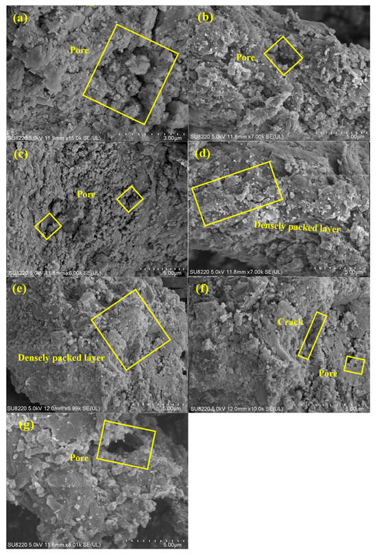 The microstructures of the cement stone in HGY concrete with different stone powder contents are shown in Figure 7. The comparative analysis of cement stone microstructures revealed that hydration products dominate the surface morphology, forming a densely packed matrix. As shown in Figure 7a, HGY concrete devoid of stone powder exhibits a porous microstructure characterized by interconnected macro-pores. At 3% and 5% stone powder content (Figure 7b,c), pore volume initially decreases, transitioning to smaller, isolated pores, though the microstructure remains loosely consolidated. At 7% and 9% stone powder content (Figure 6d,e), hydration products form a continuous, densely packed layer, significantly reducing porosity. At 12% and 15% stone powder content (Figure 7f,g), microcracks and localized pore coalescence emerge, culminating in macropore formation at 15% content, accompanied by diminished hydration product density. These findings demonstrate that moderate stone powder additions (≤9%) optimize the pore structure of HGY concrete, enhancing its abrasion resistance; whereas, excessive dosages (>9%) degrade microstructural integrity. However, when the content of stone powder is too high, the stone powder particles themselves are relatively fine. Too much stone powder will cause the particle gradation inside the concrete to be unbalanced, and it cannot play an ideal filling role in the skeleton, resulting in the formation of large voids or holes inside the concrete. Moreover, the addition of a large amount of stone powder will impede the cement hydration process and reduce the generation of hydration products [39].