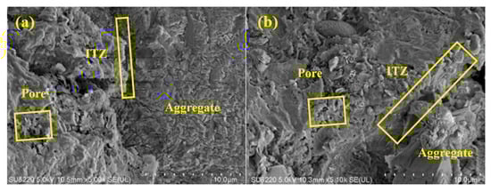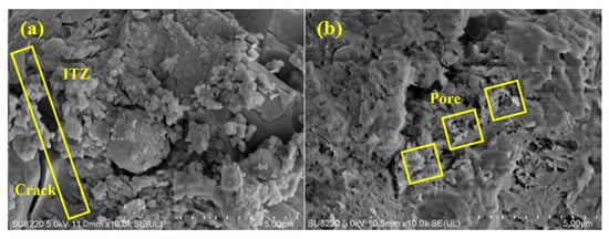 The microscopic morphology of the interface transition zone of HGY concrete with different contents of stone powder are shown in Figure 10. By comparing the microscopic morphology of the interface transition zone in specimens with different contents of stone powder, when the content of stone powder is 0%, there are obvious penetrating cracks in the interface transition zone, and the boundary of the aggregate can be clearly seen. When the content of stone powder is 3%, the hydration products in the interface transition zone increase, and part of the cracks are covered by the accumulated hydration products. When the content of stone powder is 5%, the coverage range of the high-quality hydration products is further expanded, and currently, it is difficult to distinguish the boundary of the interface transition zone, leaving only some holes. When the content of stone powder is 7% and 9%, the hydration products gradually accumulate to fill the holes. Currently, the pore structure is relatively small, and the hydration products in the interface transition zone gradually develop towards the aggregate area. When the content of stone powder is 12% and 15%, the accumulation of hydration products is concentrated, and larger holes are formed. This indicates that the added stone powder plays the role of a crystal nucleus, and a large amount of hydration products can accumulate on the cement matrix and even on the surface of the aggregate. When the content of stone powder is small, it can strengthen the strength of the interface transition zone. However, when the content of stone powder is too high, which leads to the formation of relatively large holes in the formed concrete, it will instead reduce the bonding strength between the aggregate and the cement matrix.