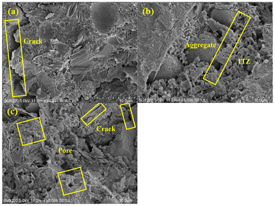 Morphology of ITZ in concrete with different fine aggregate lithologies ((a) HS, (b) SHY, (c) HGY).