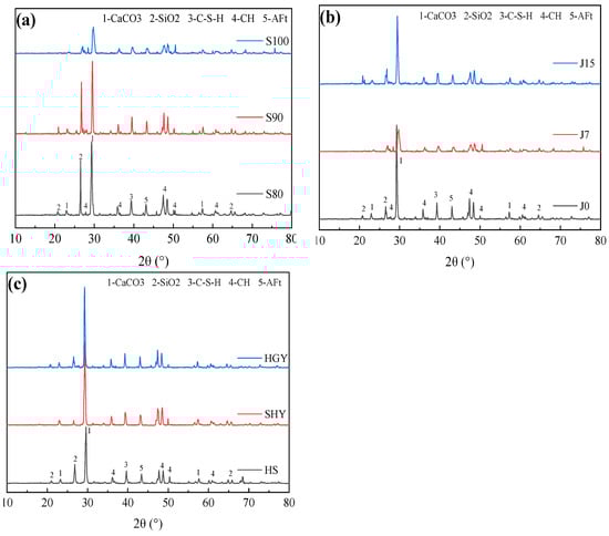 S80, S90, and S100 were selected to compare the XRD patterns of HGY concrete under different effective sand contents, as shown in Figure 12a. As can be seen from Figure 12a, the types of characteristic peaks in the XRD patterns of the specimens in each group are similar, indicating that different effective sand contents have no effect on the types of hydration products of HGY concrete. The silica in the sand used mainly exists as quartz, a crystalline silica with high chemical stability that typically does not react directly with calcium hydroxide under conventional concrete curing conditions [40]. However, the peak values of the characteristic peaks vary, especially for the carbonized products represented by CaCO3 and the minerals of fine aggregates represented by SiO2. When the effective sand content increases to 100%, the contents of CaCO3 and SiO2 decrease significantly. In specimens with low effective sand content, calcium hydroxide (Ca(OH)2) mainly participates in the carbonation reaction. In high effective sand content conditions, quartz alters the concrete’s pore structure and local chemical environment [41]. This indirectly affects the hydration process by possibly promoting the formation or transformation of other hydration products, thus increasing the overall hydration degree. Therefore, for the concrete with a high effective sand content, the hydration degree is high, and the structure is dense, which can enhance the durability of the concrete.