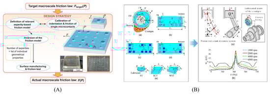Influence of surface roughness. (A) Regular rough surfaces []. (B) Effect of different roughness of interface on crankshaft bearing performance [], (a–e): Crankpin bearings lubrication model and design of various textures on the bearing surface; (a,b): The dynamic model of the slider-crank mech anism and impacting load on the crankpin under various engine speeds.