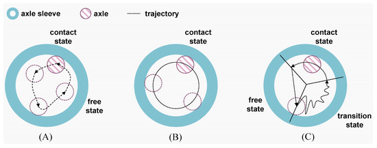 As an important characteristic parameter of system operation, the clearance of kinematic pairs in mechanical transmission systems directly affects the system’s operational dynamics and service dependability. The nonlinear collision effects and dynamic contact state jumps induced by the clearance invalidate the traditional continuum assumption and need to be quantitatively characterized by dedicated contact models [,]. Since the beginning of the research to date, three commonly used methods for modeling the dynamics of clearance-containing mechanisms, namely, the two-state model, the continuous contact model, and the three-state model, have been gradually developed, as shown in Figure 6.