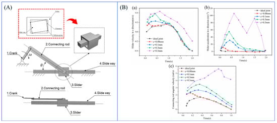 Contact detection and dynamic characterization of translational clearance contact joints []. (A) Slider-crank mechanism with clearance translational joint. (B) Effect of clearance size on kinematic characteristics, (a–c) velocity, acceleration, angular velocity.