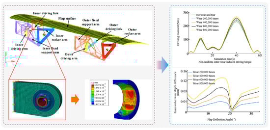 Among them, dynamic simulation achieves the quantification of the impact of clearances on overall mechanism dynamics (e.g., vibration spectrum broadening and motion accuracy attenuation) through multibody system modeling (e.g., ADAMS and RecurDyn) [,,], whereas finite element analysis (e.g., Abaqus and ANSYS) analyzes the mechanism of contact stress concentration and wear hotspot formation at the microscale [,]. The deep integration of the two can not only reproduce the transient impact characteristics of the hinge collision of the wing deployment mechanism but also allow for the prediction of bearing surface wear [,], providing multiscale data support for the digital empowerment study (Figure 8). Researchers can predict the evolution trend in interface behavior under extreme operating conditions (e.g., heavy load impact, temperature alternation) at the design stage [], significantly reducing experimental cost and shortening the R&D cycle, marking the paradigm shift from empirically driven to model-driven research on mechanical transmission systems.