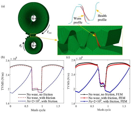 The finite element method validates the gear model in three cases: no friction wear, no friction wear, and no friction wear []. (a) The FEM of gears with wear. (b) TVMS calculated by the IM. (c) TVMS calculated by the FEM.