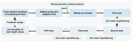 In recent years, researchers have begun to deeply integrate finite element analysis (FEA) with dynamics analysis for a more comprehensive understanding of the properties of mechanical systems. Dynamics analysis places emphasis on the overall motion behavior and dynamic response of the system, while finite element analysis provides detailed information on microscale contact and wear behavior (Figure 9) []. For example, in the research on the fretting wear of the control rod cladding, finite element simulation and experimental observations were combined, and the numerical calculation results validate the model’s accuracy []. The dynamic load data of the kinematic pairs under typical working conditions were obtained through a dynamics simulation model and imported into the finite element model as boundary conditions. The wear depth of kinematic pairs was accurately predicted by integrating finite element simulation to analyze contact stress distribution and employing a modified Archard wear model. This approach establishes a scientific foundation for investigating the wear characteristics of such pairs [,]. This closed-loop framework of “macroscale load input–microscale wear output” effectively overcomes the limitations of the traditional single-scale simulation and provides methodological support for the life prediction and reliability device of complex mechanical transmission systems (Figure 10).