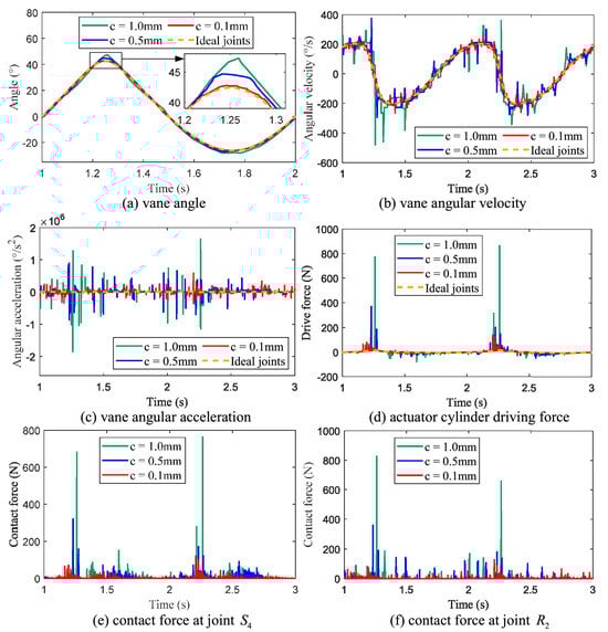Subsequently, researchers began to focus on more complex mechanisms and systems. The impact of joint contact force models, clearance size, and crank input speed on the dynamic performance of RSSR space mechanisms was analyzed by simulation [,]. Collision contact points between the ball head and ball socket tend to concentrate in two specific regions within the clearance ball. Moreover, clearance size emerges as the primary factor influencing both the fluctuation of the mechanism’s crank output angular acceleration and the joint contact force at the ball joint. The size of the clearance size exhibits a nonlinear positive correlation with the changes in crank angular acceleration and the size of joint contact force (Figure 11) [,,,].
