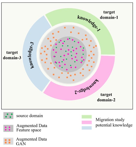 The data enhancement technology method realizes targeted breakthroughs through a hierarchical strategy. Feature space expansion and generative adversarial networks form a hierarchical enhancement framework of “filling–expanding” (Figure 13), which consolidates the data foundation and expands the data distribution. Feature space expansion expands data in a single domain by means of interpolation or extrapolation, which is suitable for scenarios where the laws in the domain are clear. Still, the data are sparse [,], while the generative adversarial network extends the distribution boundary by virtue of its powerful generative ability while increasing the diversity and quantity of data [,].