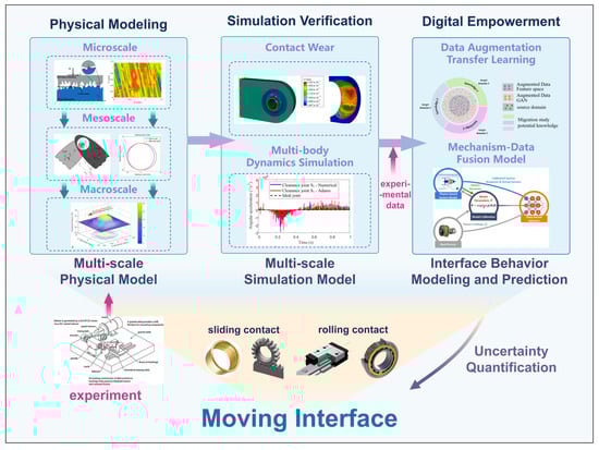 An extensive examination of motion interface behavior in mechanical transmission systems is crucial for maintaining the smooth operation of such systems. Recent advancements in science and technology, such as multiscale physical modeling [,], simulation technology [,], and big data analysis [,], have introduced novel theories and methodologies for investigating motion interface behavior. Multiscale physical models achieve theoretical coupling in different scales [] and build a multiscale correlation path from surface microtopography to macroscale dynamics []. Simulation techniques integrate finite element analysis [] and multi-body dynamics [] to reproduce the multiscale evolution of interface behavior in a virtual environment. Data-driven methods break through the bottleneck of scarce experimental data through data augmentation [,,] and transfer learning [] to realize life prediction under various working conditions [,,].