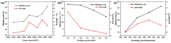 Effect of laser-cladding process parameters on dilution and porosity: (a) laser power, (b) scanning speed, and (c) power flow rate.