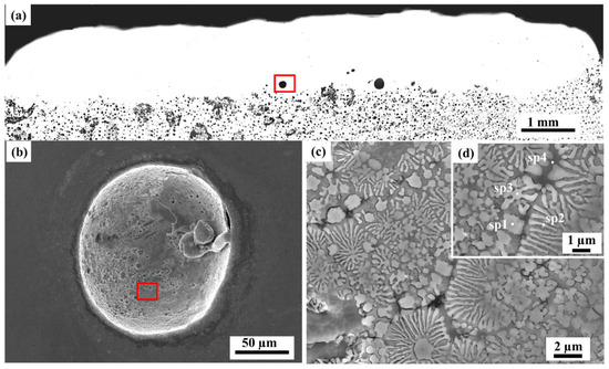 Figure 2 illustrates the cross-sectional macro-morphologies of the Hastelloy C276 alloy coating. Some pores could be observed on the coating. The pores in the coating were mainly distributed in the interface between the coating and ductile iron substrate [26]. The size of the pores in the C276 coating was relatively large without the addition of Ti/Al. The maximum value was 220 μm. Because of the large distance between the bubble position and surface of the layer, the gas could not escape and formed a bubble at the interface between the substrate and the coating [27,28]. Moreover, a small amount of metal could be evaporated with laser irradiation. When the overflow rate of the gas was slower than the solidification rate of the molten pool, it was retained within the coating to form pores [29]. In addition, Figure 2b shows that the shape of the pore is regular and spherical, and the inner wall of the pore is smooth. Figure 2c displays the microstructure inside the pore, which shows that the microstructure is flower-like, and the dendrites radiate from the center to the outside. The pores could be induced by the trapped gas in the cladding during the cooling of the molten powders. This gas may be Ar gas used to protect the pool and convey the cladding powder. The energy dispersive spectroscopy (EDS) results of the inner wall of the pore in Figure 2d are shown in Table 3, the content of C and O elements is relatively high. The reaction between C element and metal oxide at high temperature will produce CO pores. It also can be the CO2 or CO gas produced by the reaction of graphite nodules and oxygen. With the solidification of the molten pool, the gas does not have enough time to float, and then forms pores at the interface between coating and substrate. Due to the pressure in the pores, the dendrites grow outward, evenly, and the front edge becomes smooth. On the other hand, the pores form in a regular, spherical shape.