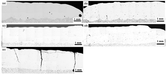 The cross-sections of different Ti contents are showed in Figure 3. It can be seen from Figure 3 that, compared with the coating without Ti, the pore size of the coating with Ti is smaller, and the porosity within the coating gradually decreases with the increase in Ti content (from 1%Ti to 5%Ti); when the Ti content was 7.5 wt.%, pores were not found on the cross-section of the coating, as shown in Figure 4. Notably, a significant number of longitudinal cracks were observed in the 10%Ti-containing coating, extending through to the coating surface and resulting in coating fracture. This can be attributed to how Ti reacts easily with oxygen to form oxides, which reduces the possibility of the graphite making contact with oxygen. The cross-sectional morphologies of the coating with Al are showed in Figure 5. It can be seen that there are no pores on the coating cross-section. The reason is that the affinity between Al and oxygen is stronger than that of Ti, which makes more oxygen react with Al, thus reducing the chance of a reaction with graphite and avoiding the formation of pores. However, the addition of Al resulted in the formation of transverse cracks at the coating/substrate interface, as well as longitudinal cracks propagating perpendicular to the substrate surface along the coating-thickness direction.