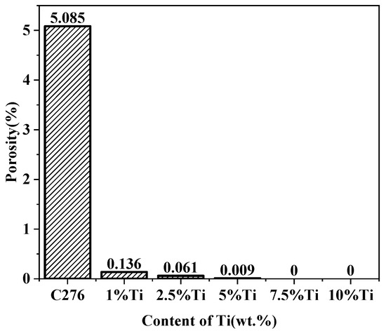 Cross-sectional morphologies and porosity of the coatings: (a) 1%Ti, (b) 2.5%Ti, (c) 5%Ti (d) 7.5%Ti, and (e) 10%Ti.