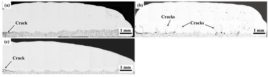 Conversely, Al addition demonstrates different failure mechanisms. Microstructural characterization shows no coarse eutectic formation, but interfacial cracking occurs at the cladding–substrate boundary with crack propagation perpendicular to the interface. This phenomenon originates from two factors: (1) the strong oxygen affinity of Al facilitates Al2O3 formation at the interface, creating brittle intermetallic compounds that weaken the metallurgical bonding strength; and (2) these Al2O3 particles act as preferential crack initiation sites, with subsequent thermal, stress-driven propagation into the cladding layer. This comparative analysis demonstrates that while both elements effectively mitigate porosity through oxygen scavenging, their distinct phase formation characteristics necessitate careful compositional optimization to balance pore reduction and crack resistance in laser-clad C276 alloy systems.