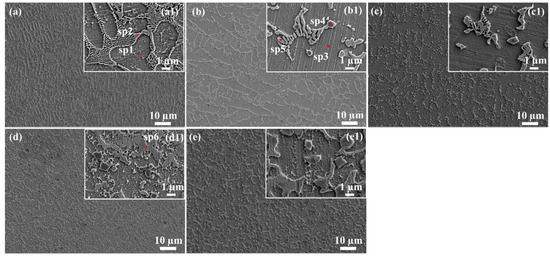 SEM morphology of coating: (a) Hastelloy C276, (b) 1%Ti, (c) 2.5Ti, (d) 5%Ti, and (e) 7.5%Ti. (a1) The partial enlarged view of Figure (a), (b1) The partial enlarged view of Figure (b), (c1) The partial enlarged view of Figure (c), (d1) The partial enlarged view of Figure (d), (e1) The partial enlarged view of Figure (e).