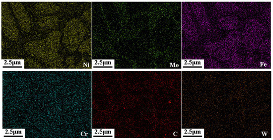 The chemical composition distribution maps for Ni, Mo, Fe, Cr, C, and W in the C276 coating.