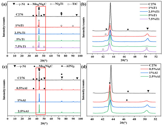 XRD patterns of the C-276 and modified cobalt coatings: (a) different contents of Ti, (b) the local, enlarged drawing of the red box in Figure (a), (c) different contents of Al, and (d) the local, enlarged drawing of the red box in Figure (c).