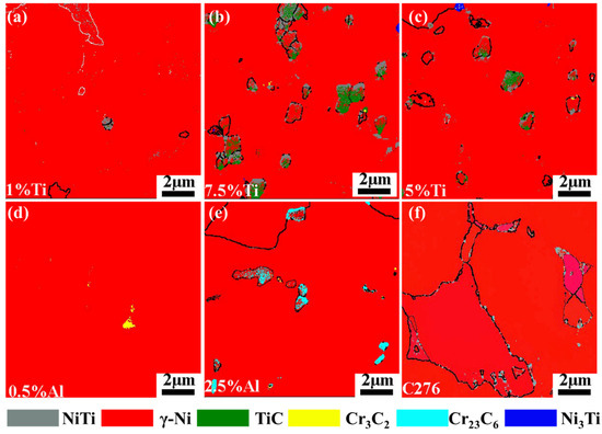 In order to distinguish the distribution of each phase, EBSD maps were created to characterize the features of the phases in the Hastelloy C276, 1%Ti, 5%Ti, 7.5%Ti, and 0.5%Al, 2.5%Al coatings, as shown in Figure 10. The titanium-modified coating consists of γ-Ni matrix, TiC, Cr3C2, Ni3Ti, and NiTi. It can be seen that TiC and NiTi coexist. With the increase in the titanium content, the distribution of TiC gradually increases. Combined with Figure 5, it shows that the irregular particles and cuboidial particles are mainly composed of TiC and NiTi. Furthermore, the NiTi is distributed in the peripheral region of TiC. The aluminum-modified coating consists of the γ-Ni matrix and MC. Because of the low content of aluminum, it is difficult to identify the phase containing aluminum.
