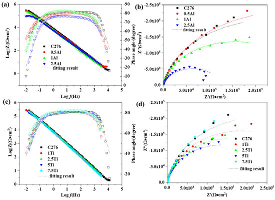 Nyquist diagrams of (a) C276 + Al coatings and (b) C276 + Ti coatings; Bode diagrams of (c) C276 + Al coatings and (d) C276 + Ti coatings.