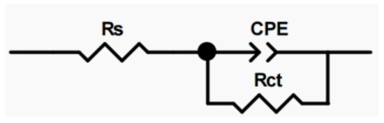 Electrochemical impedance spectroscopy (EIS) measurement is an effective method to study the electrochemical corrosion of metal materials. Nyquist and Bode diagrams of the coatings were assessed according to the open circuit potential, as seen in Figure 13. It can be seen from the Nyquist diagram that the difference in the capacitance arc radiuses reflects the difference in the impedance values. The variation in the impedance modulus and phase angle with time can be seen in the Bode diagram, and the time constant of the research system can be determined from the phase angle diagram. A time constant can be seen in the Bode diagrams in Figure 13c,d. In order to deeply analyze the possible relevant interface characteristics of the studied system, the equivalent circuit of R(CR) shown in Figure 14 was used to fit the impedance results by Zview 3.1 software. Rs represents solution resistance. Rct is the charge transfer resistance. CPE is a constant phase element related to the electric double-layer capacitance. It can be seen in Figure 13a,b that with the increase in the Al and Ti content, the radius of the capacitive arc and the charge transfer resistance (Rct) gradually decrease, as seen in Table 6, indicating that the compactness of the passivation film on the surface of the coating decreases and the corrosion reaction is easier, but the Rct of 7.5% Ti increases, which is also consistent with the potential dynamic polarization results.