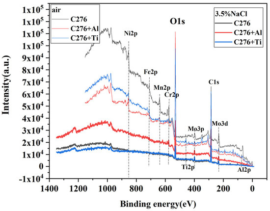 In order to further understand the passivation mechanism of the three alloys in the 3.5%NaCl solution, components on the surfaces of non-corroded and corroded specimens are characterized. Figure 15 and Figure 16 show the results of the XPS survey spectrum scanning and peak fitting of C276, 2.5%Al, and 5%Ti coatings. The primary peaks are generated by the photoelectron process, some of which are composed of double peaks, which is the result of spin orbit splitting, which occurs in all orbits except the s orbit. The spectral lines of the measured samples were calibrated by the C1s (binding energy: BE = 284.8 eV) standard pollution peak. It can be seen from the spectrum that the non-corroded surface, i.e., in air, and the corroded surface mainly contain Ni, O, Cr, and Mo elements. In order to further explore the corrosion products that formed on the coating surface in the 3.5 wt.% NaCl solution and determine their chemical composition and structure, and compare them with the surface composition of the non-corroded product, it is necessary to determine the structural composition of the corrosion products by analyzing the high-resolution narrow spectrum of different elements in the corrosion products formed on the coating surface.