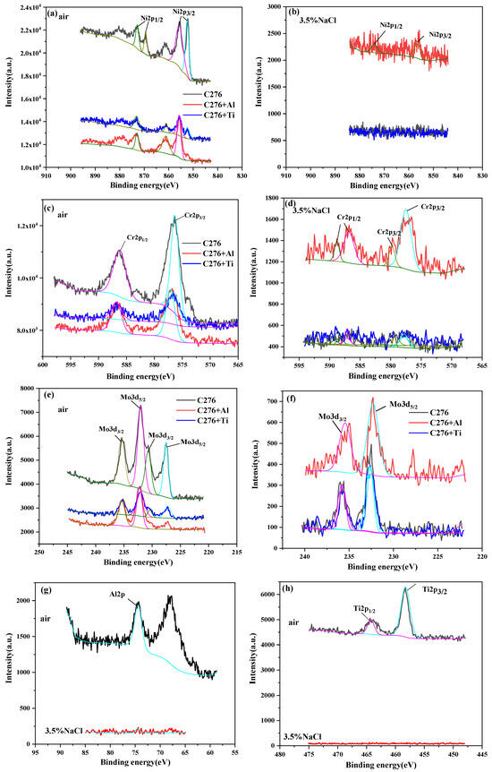 XPS regional scan spectra on the surface of the peak (a) Ni2p in air and (b) Ni2p in the 3.5 wt.% solution, (c) Cr2p in air and (d) Cr2p in the 3.5 wt.% solution, (e) Mo3d in air and (f) Mo3d in the 3.5 wt.% solution, and (g) Al2p and (h) Ti2p.
