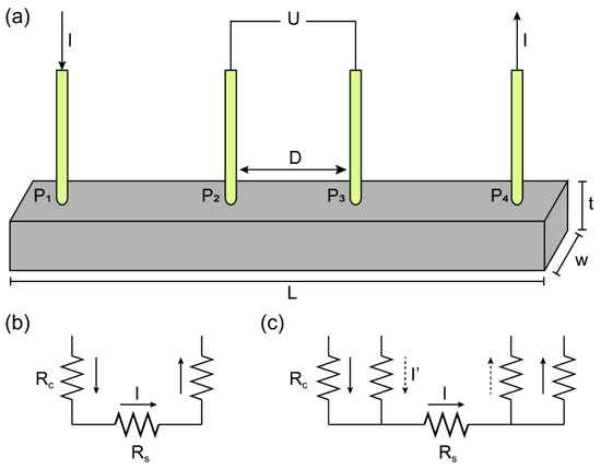 Figure 1. (a) Four-probe method for electrical conductivity measurement. Equivalent circuits of (b) two-probe method and (c) four-probe method.