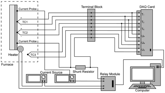 The general schematic of the experimental setup is shown in Figure 3. The whole setup is designed for allowing easy modifications as well as replacement of individual parts. The central control unit is a computer on which the measurement program based on C# programming language is running. The program controls the data acquisition system and a relay module which is responsible for switching the sample heater and the constant current source. Simultaneously, a real-time data processing is executed then the electrical conductivity and the Seebeck coefficient displayed in the program are refreshed.