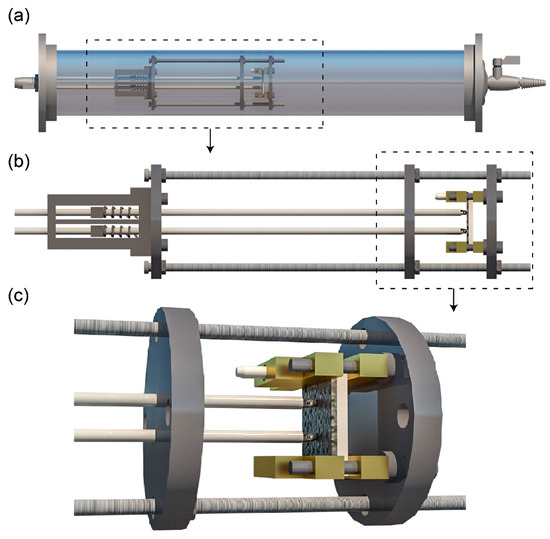 Figure 4. (a) The sample holder fixed in the tube and the details of (b) the stainless-steel framing and (c) the sample platform.