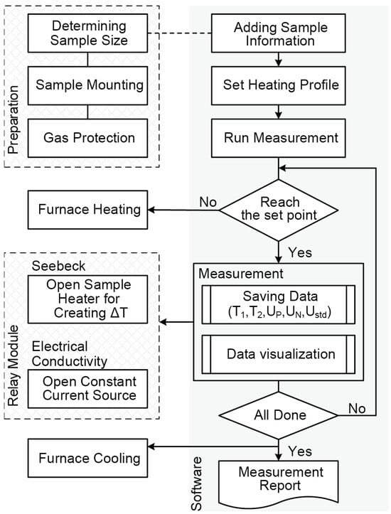 Once all the preliminary work is performed, the program begins warming up the furnace first and then heating up with a rate of 5 K/min. Upon reaching the desirable temperature, the measurement program is activated, acquiring the temperature and voltage data to estimate the Seebeck coefficient. Afterwards, the relay module switches on and the current flows through the sample. The voltage and current data for electrical conductivity calculation are collected. While all the measurements arranged in the temperature range are completed, the original data and measurement results are stored at a rate of 10 samples/sec and the furnace stops heating and cools down slowly.
