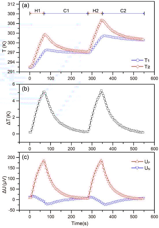 Figure 6. (a) The measured variations of T1 and T2, (b) the variation in the T , and (c) the measured voltage U n and U p for Seebeck coefficient measurement at 300 K.