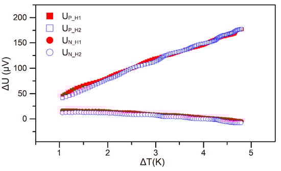 There are two heating cycling which are shown in Figure 6a. The corresponding phases are named H1, H2 for heating up and C1, C2 for cooling down, respectively. ΔT vs. ΔU data in two heating phases extracted from Figure 6 is shown in Figure 7. The obtained data almost matched and shows similar trend, indicating a good repeatability during the Seebeck coefficient measurement. The whole system being placed in the tube during the measurement helped to avoid the heat transfer by convection and radiations, which may cause temperature drift.