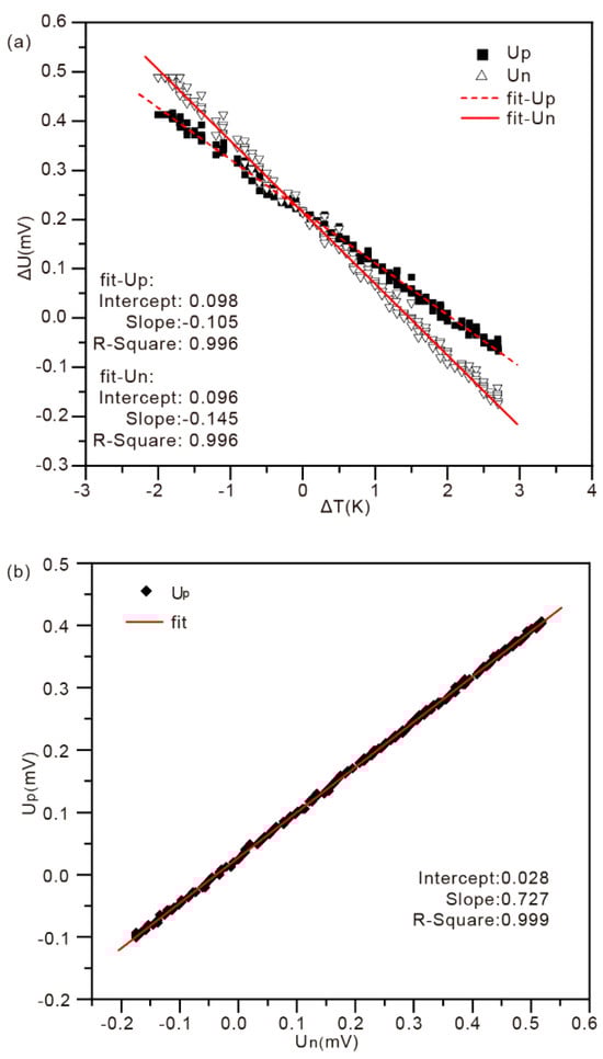 Figure 8. Seebeck coefficient measurement data (a) ΔT vs. ΔU and (b) ΔUn vs. ΔUp of HMS coating at 150 °C.